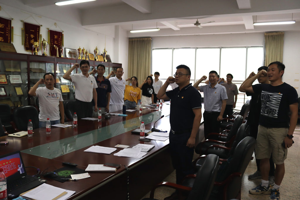活动中,党直支全体党员以重温入党誓词的形式,进一步强化四个意识,坚定理想信念,加强意识形态阵地的稳固。会议由党直支书记徐峰主持。